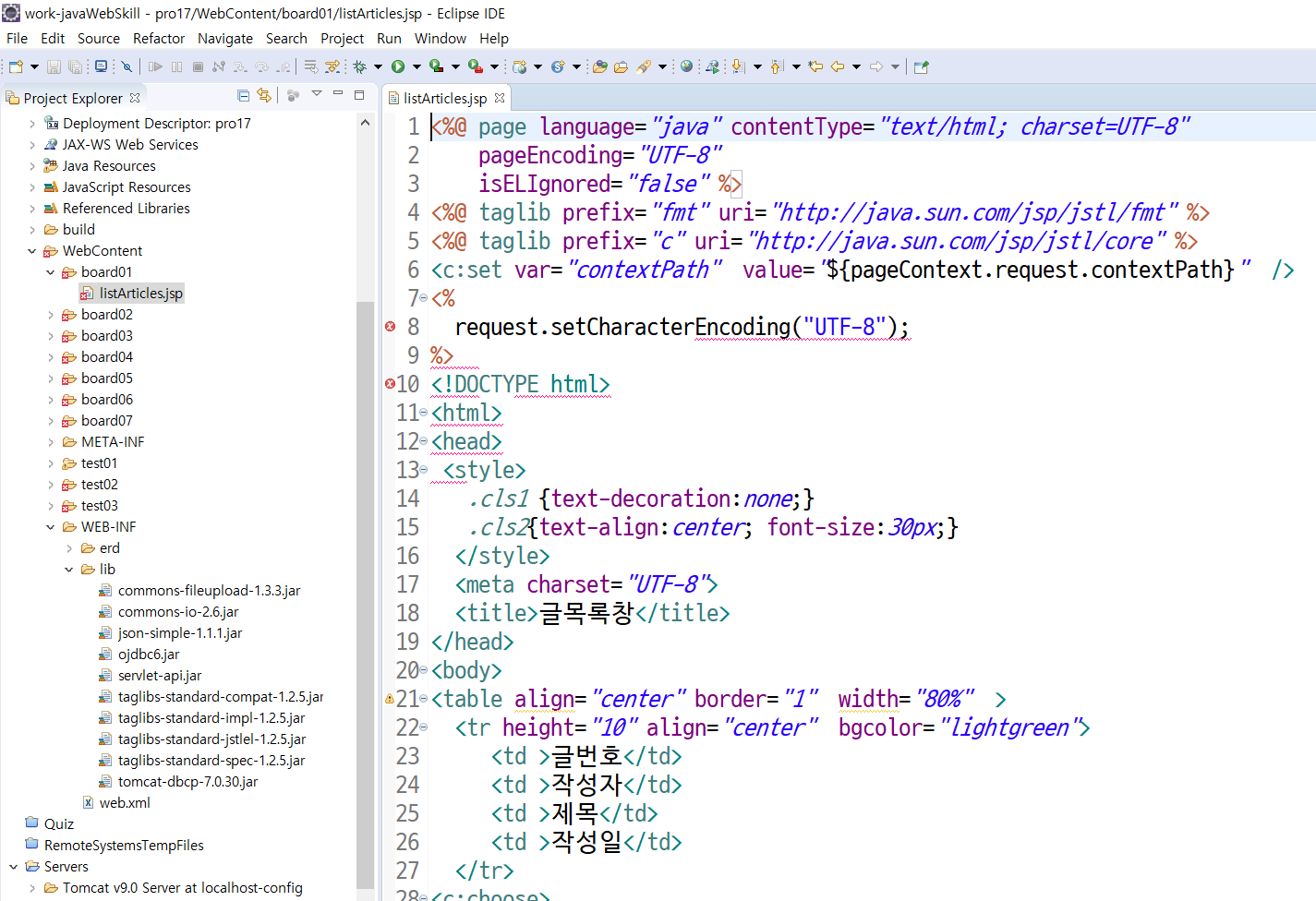 오류 코드는 javax.servlet.jsp.JspException cannot be resolved to a type 이와 같았고 찾아보니 jstl 라이브러리가 제대로 설치되지 않은 탓이라고 하여 혹여나 하고 버전이 맞지도 않는 jstl.jar파일도 넣어보고 서버 맵핑의 문제일 수도 있다고 생각하여 server파일도 몇번이나 지웠다가 다시 연결해줬는데도 오류는 해결되지 않았다.