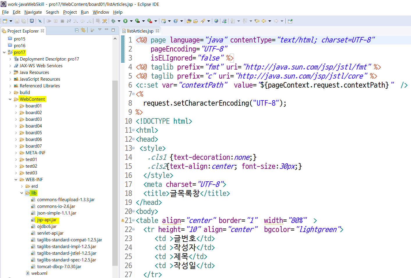프로젝트 파일의 Webcontent > lib 폴더에 jsp-api.jar 파일을 추가해주면 된다.