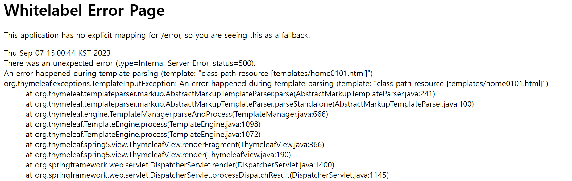 [오류잡자 찍찍찍..] Springboot | An error happened during template parsing (template: "class path resource [templates/home0101.html]")