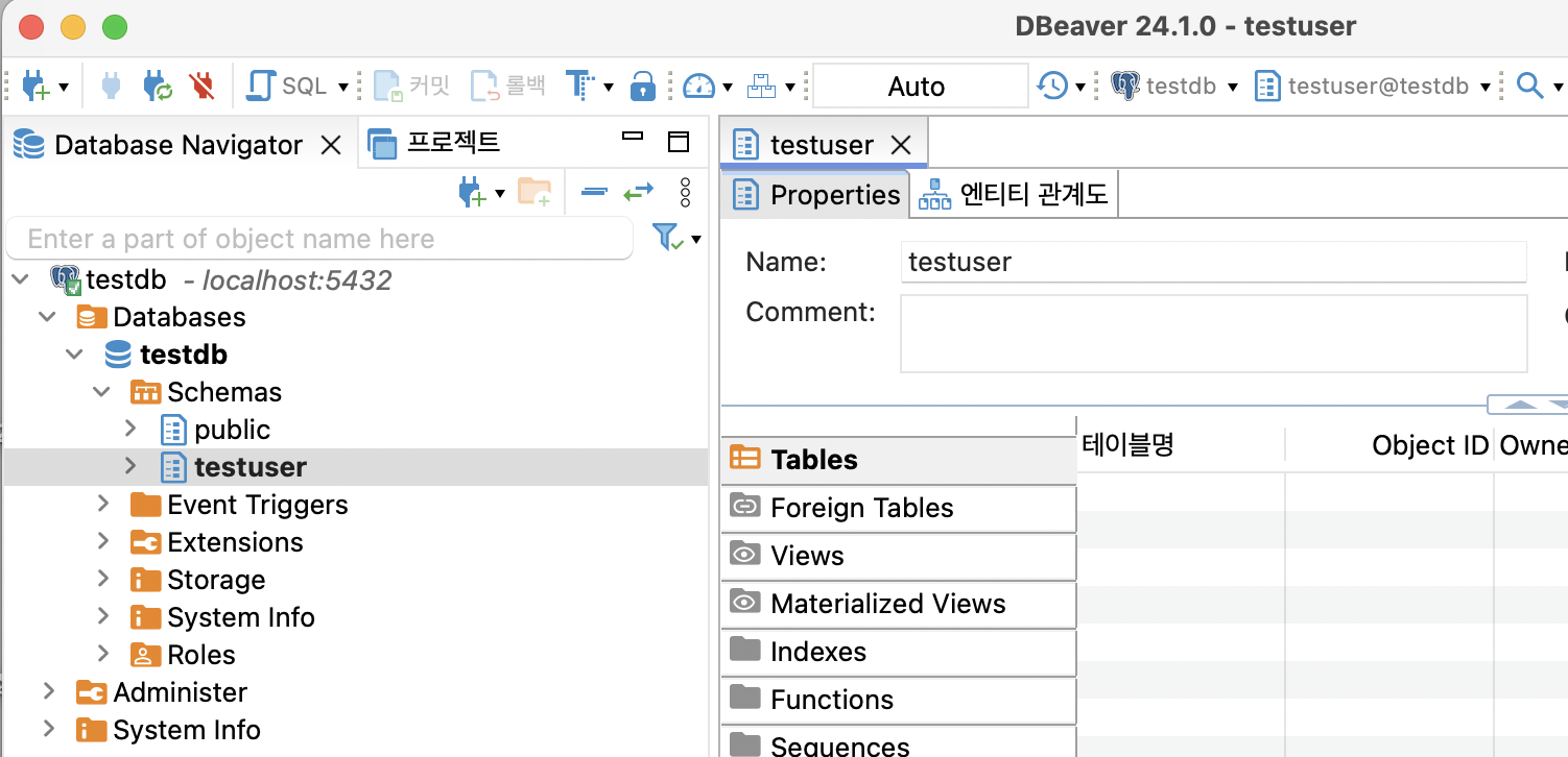 그 외 testuser 유저명과 같은 이름의 testuser라는 스키마를 생성